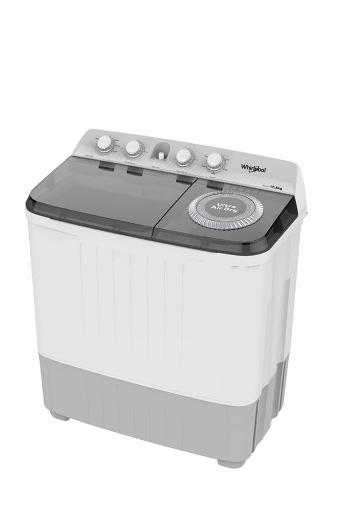 The Whirlpool NWDC10503BC is a 10.5kg twin tub washing machine featuring Ultra AirDry tech, Super Soak, a rust-proof & rat-proof body, big knobs, and 640W power, with dimensions around 85.4cm W x 99.5cm H x 49cm D, designed for durability and efficient washing/drying in a sleek, non-inverter package, commonly found in the Philippines.