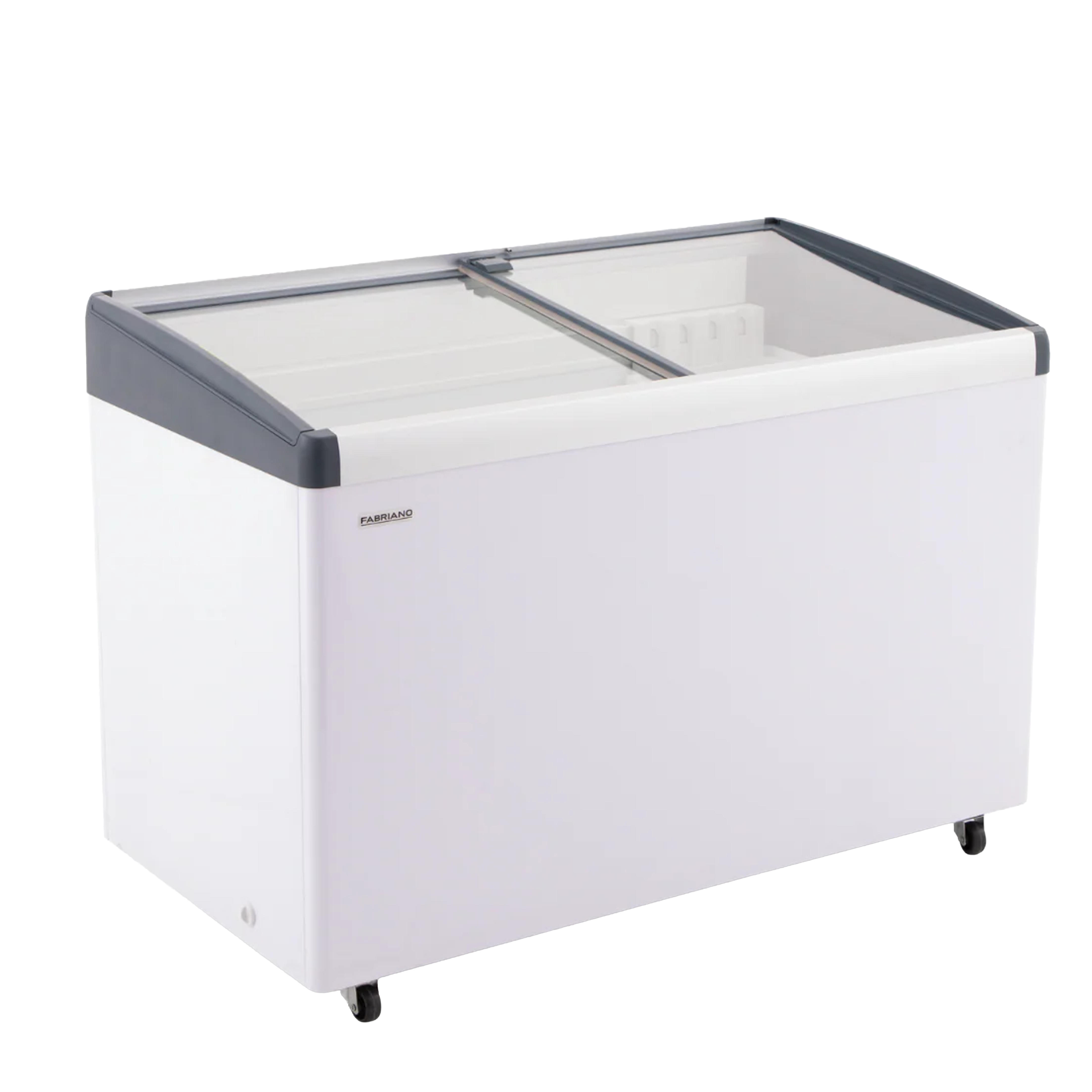 Fabriano FGTC12SG is a 12 cubic feet, dual-function glass-top showcase chest freezer, featuring sliding tempered glass doors, adjustable manual temperature control (freezing to ≤-18℃ or refrigeration 0-10℃), LED lights, a basket, lock & key, R134a refrigerant, and operates on 220-240V/60Hz power. Its dimensions are approximately 1234x653x900mm (WxDxH), with a 330L net capacity and 4 casters for mobility.