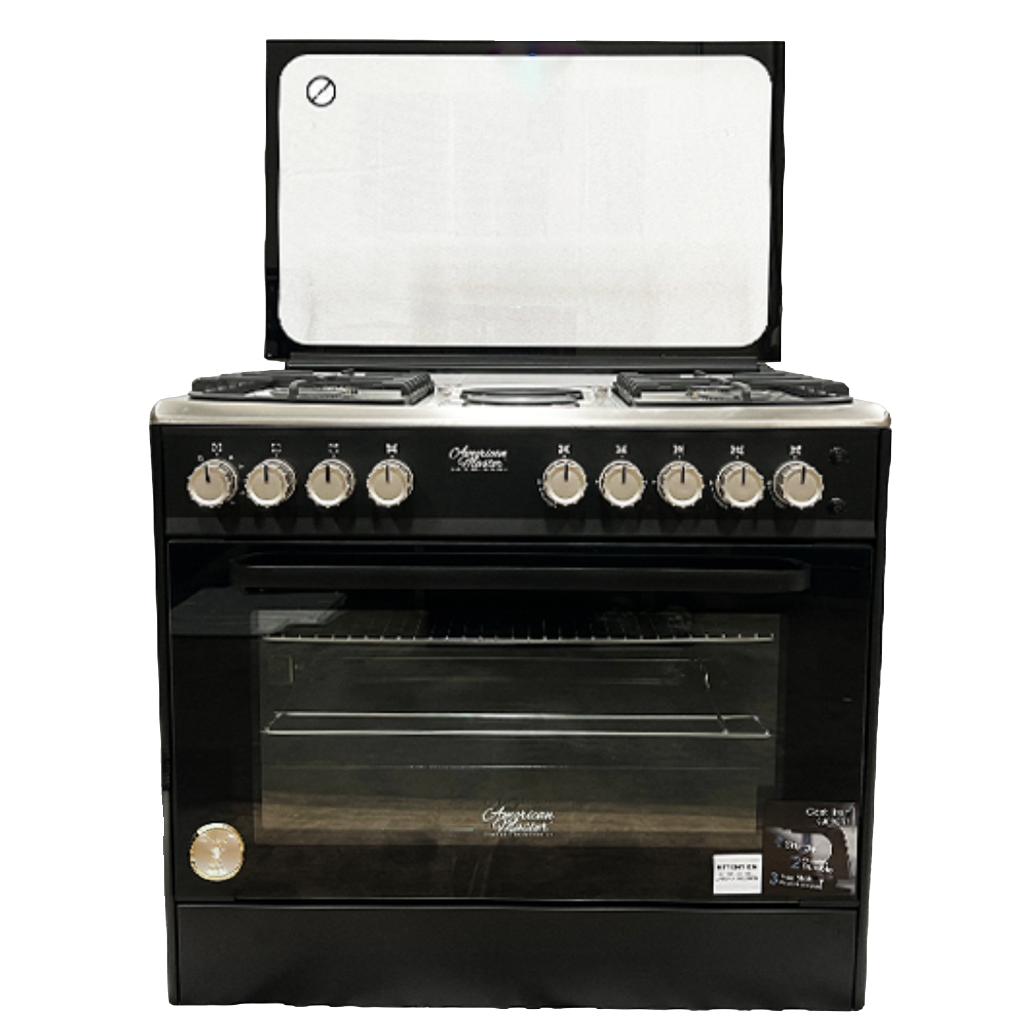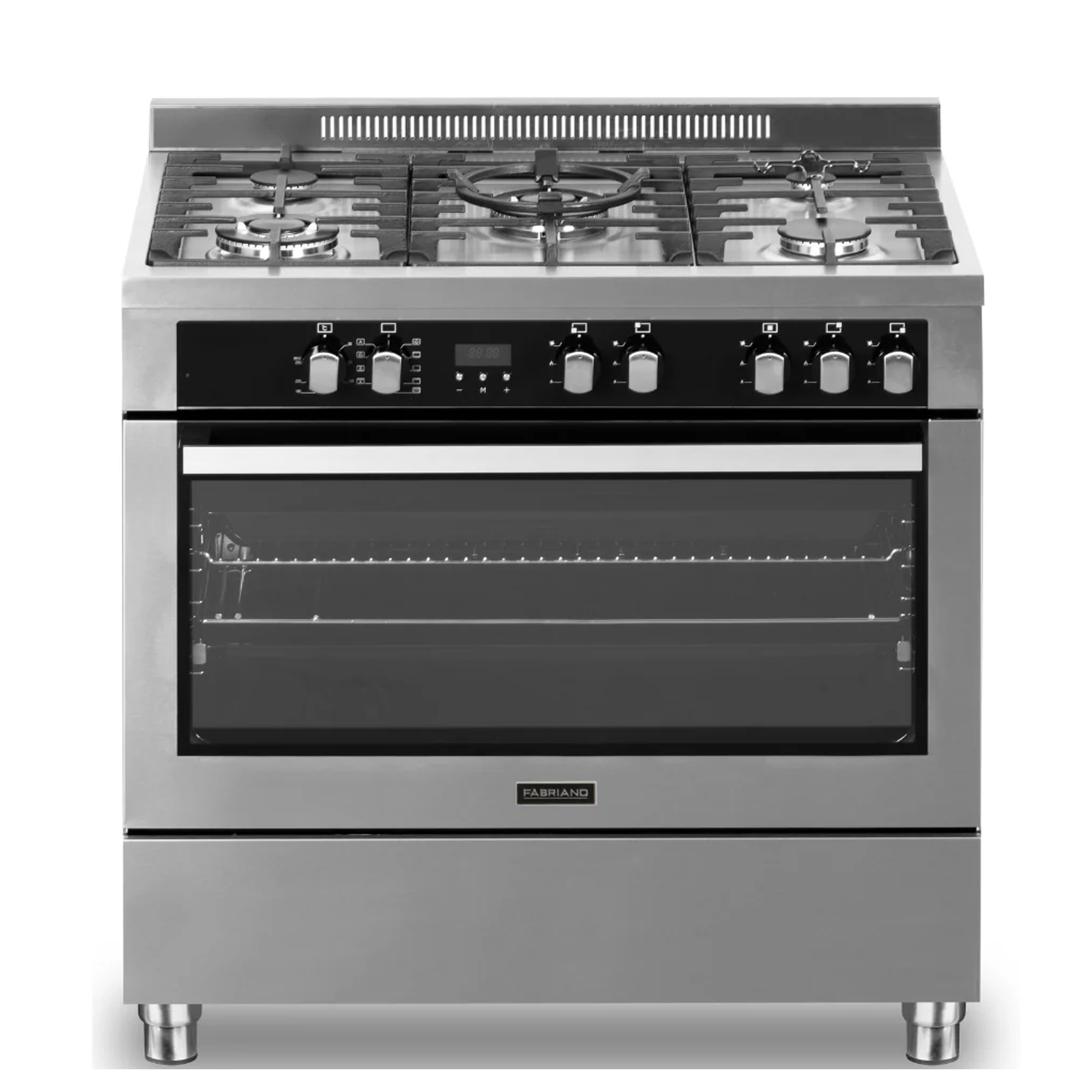 90cm Range 5 Sabaf Burners 115 Liter Gas Convection Oven & Grill Rotisserie Spit Mechanical Timer Two-Hand Electric Ignition Full Flame Failure Device Removable Low-E Full Glass Door Glass Cover Plate Built-In Thermostat Potent Burners Spacious Oven Gray Finish 25 Watts Type B -2 Flat + Ground Plug Lower and Upper Heat Convection Oven