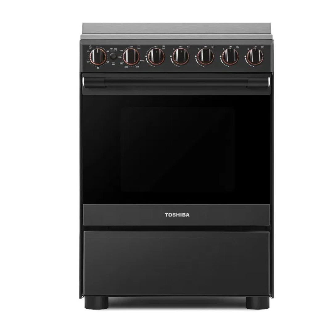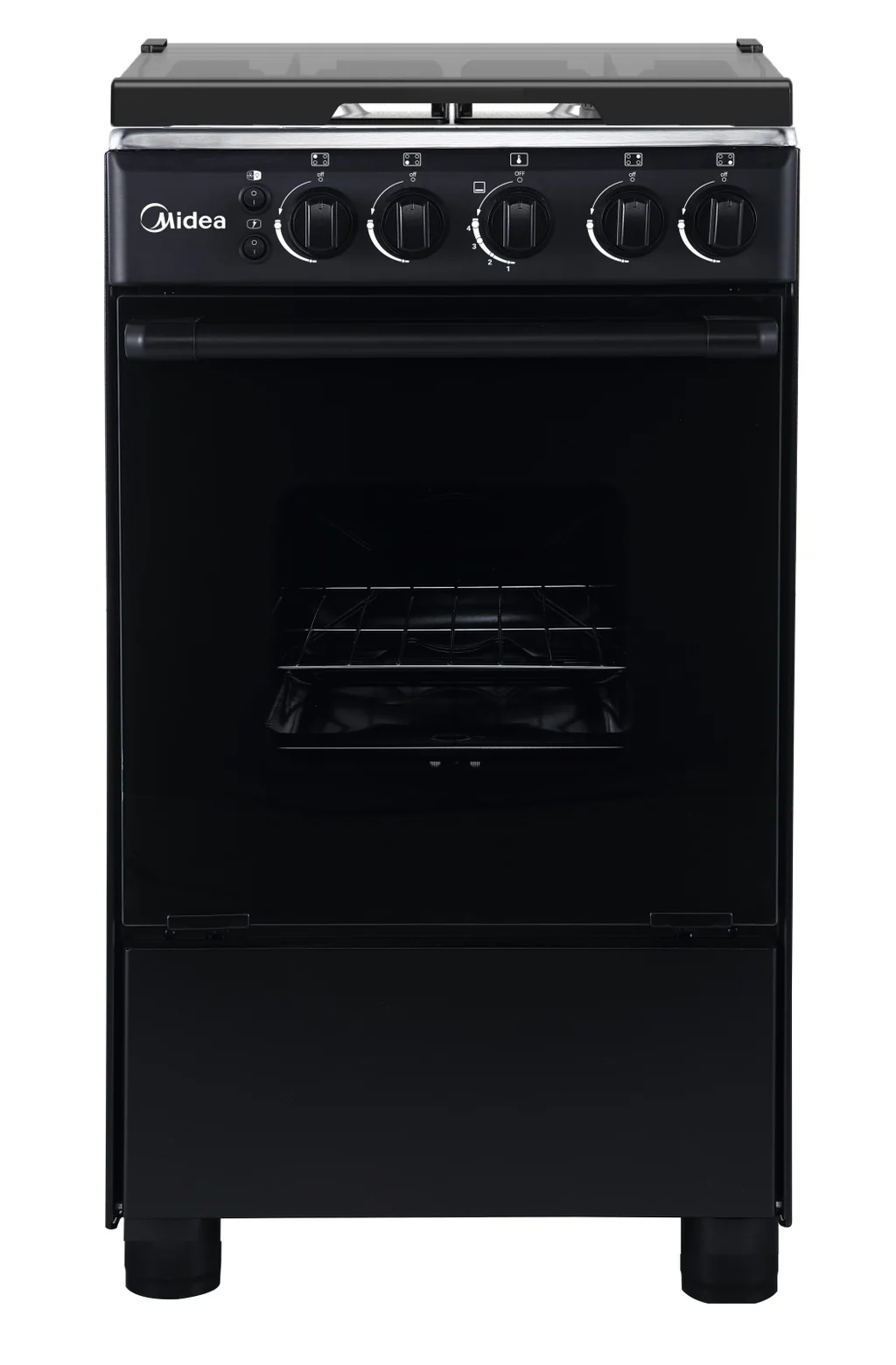 Free‑standing gas range with oven Color: Matte Black Burners: 4 gas burners Pan support: Enamel / matte black Glass lid: Yes (removable) Ignition: 2‑hand electronic ignition Controls: Front knob controls Timer: Minute minder Safety devices: Oven safety device included (burner safety varies by retailer)