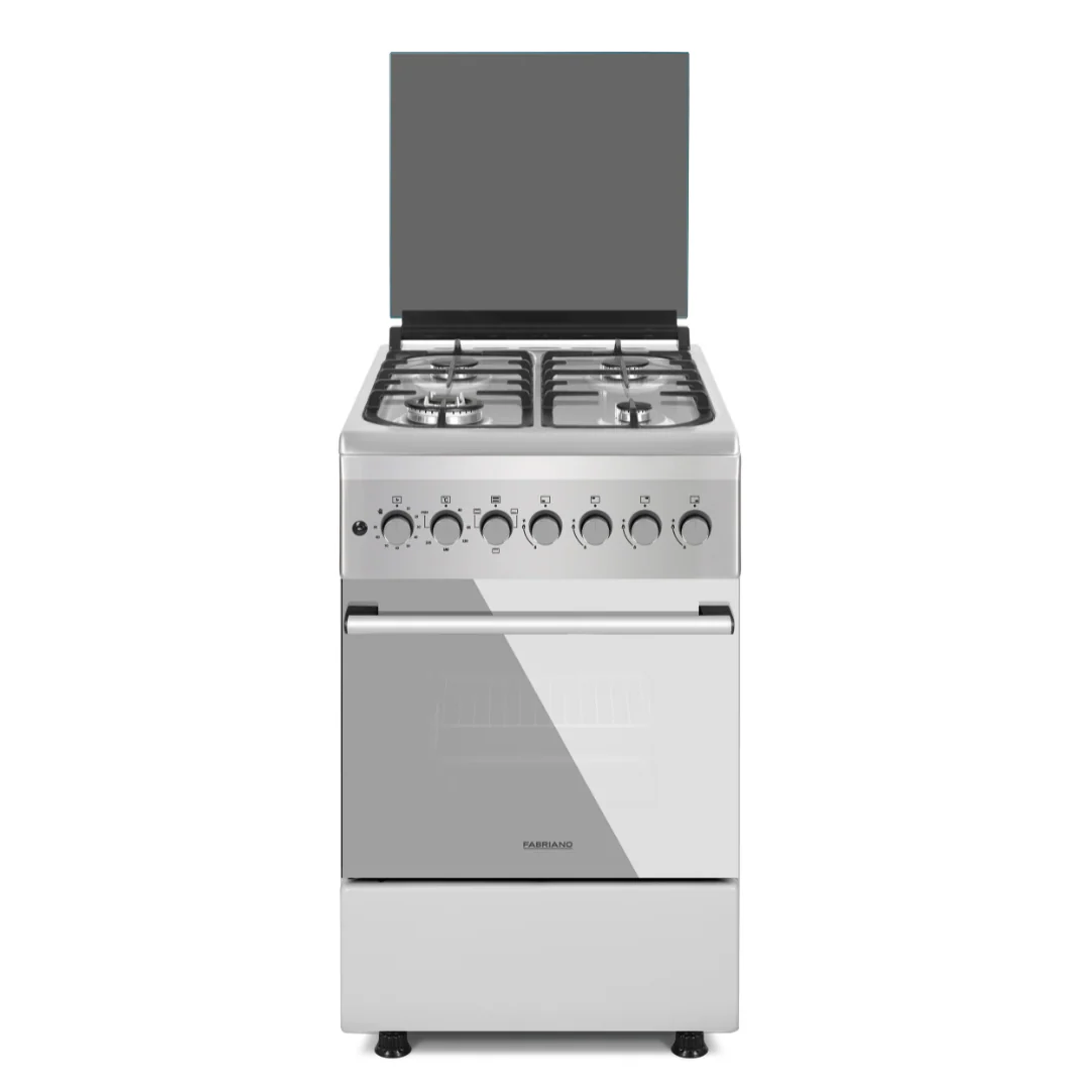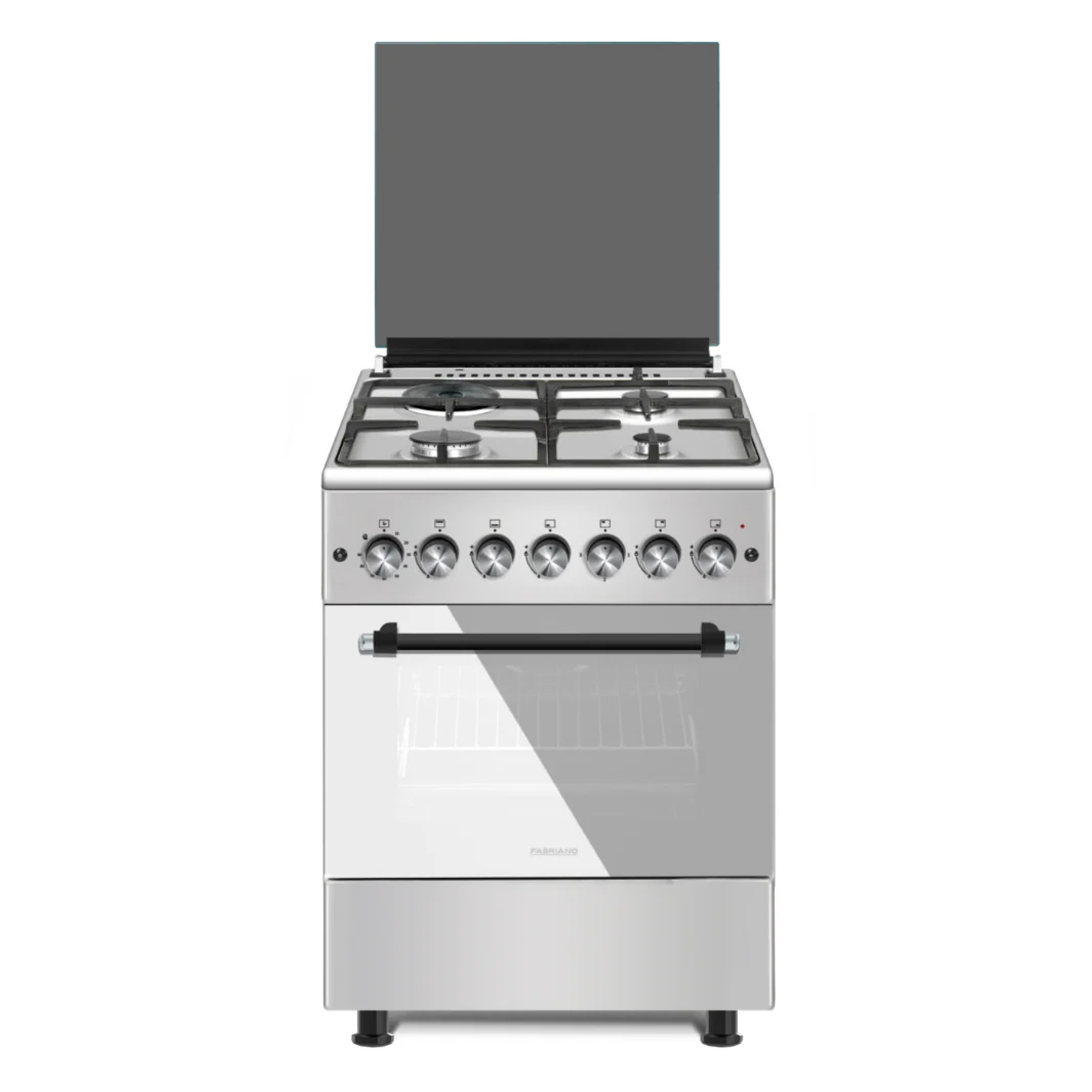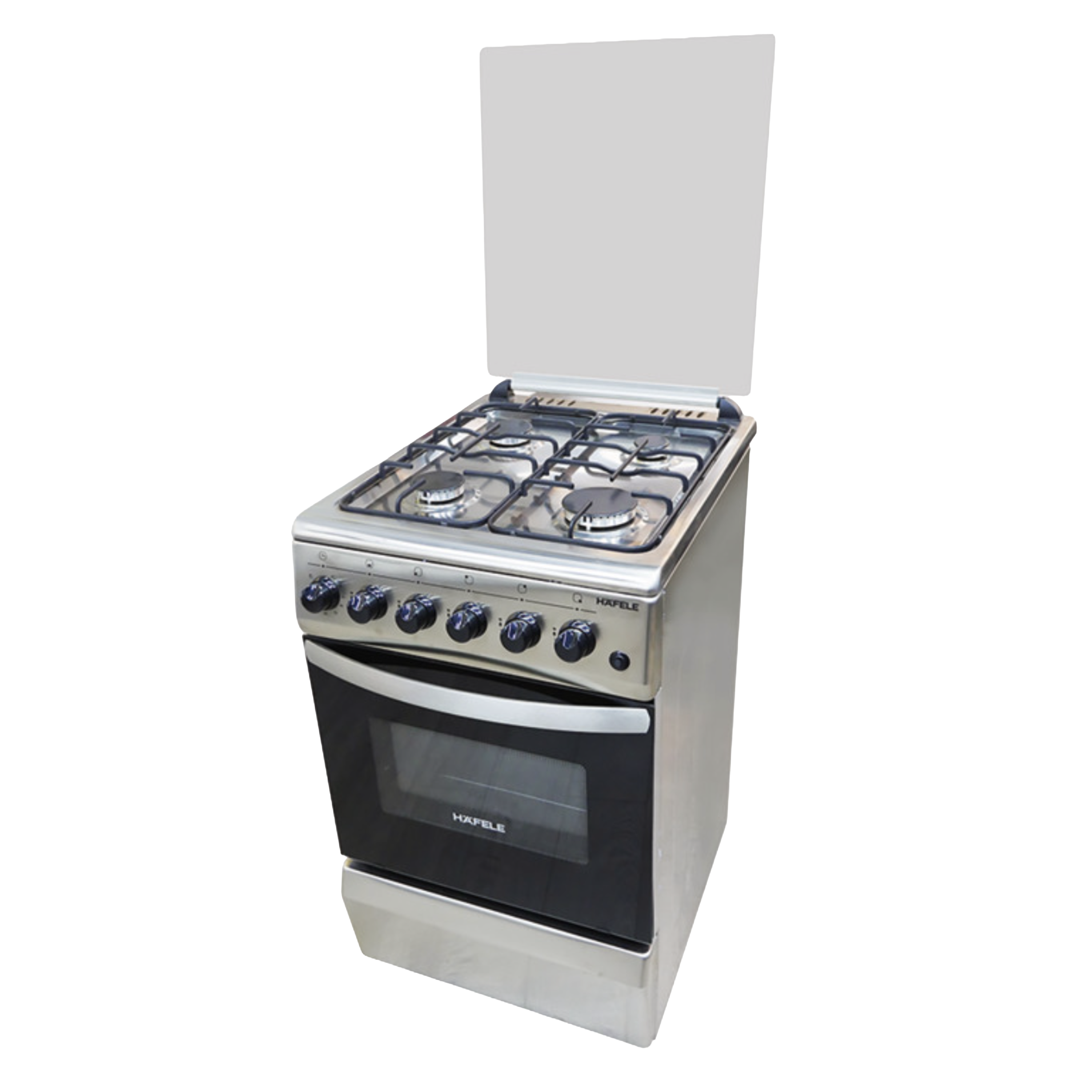 50cm 4-Gas Burner, Gas Oven, Rotisserie, Platinum grey panel-body-side Push button ignition for oven burner & hob, Matte inox cooktop, Cast iron pan support, Flame Failure Safety Device in hobs Gas Oven 58L, Metallic grey handle, Black double glass oven door, Flame Failure Safety Device in oven, Top and Bottom burner, Rotisserie Transparent glass top lid, Inox knob with black top & black ring