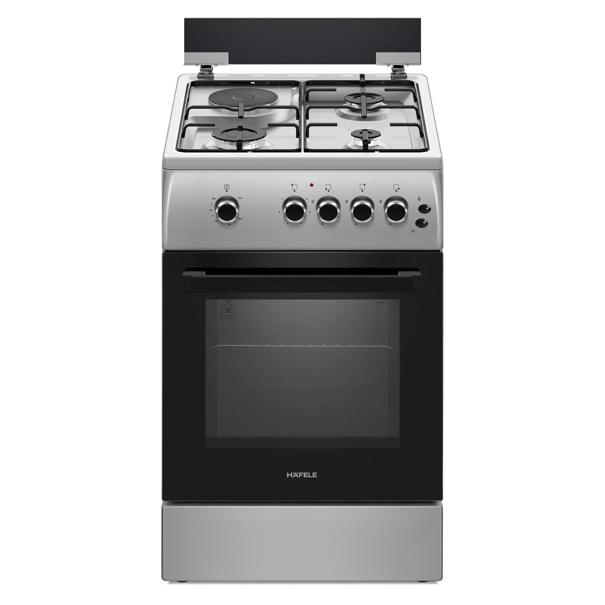 Hybrid Cooking: Gas burners for fast stovetop cooking + electric oven for precise baking and grilling. Rotisserie & Grill: Perfect for roasting meats and poultry. Spacious Oven: ~56 L capacity for family-sized meals. Stainless Steel Finish: Sleek, durable, and easy to clean. Double Glass Oven Door: Improved heat retention and safety. Front Knob Controls: Simple, intuitive operation. Safety Features: Flame failure device on gas burners. Complete Accessories: Oven tray, wire rack, rotisserie included. Freestanding Design: Easy to install anywhere in the kitchen