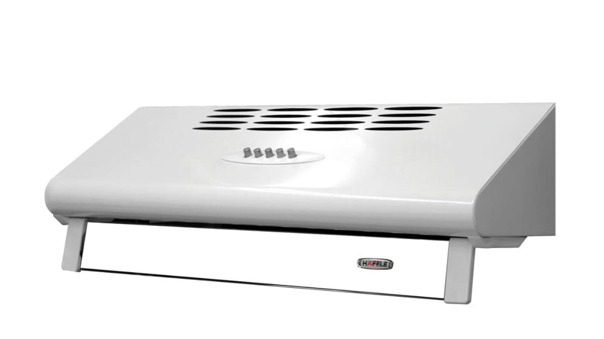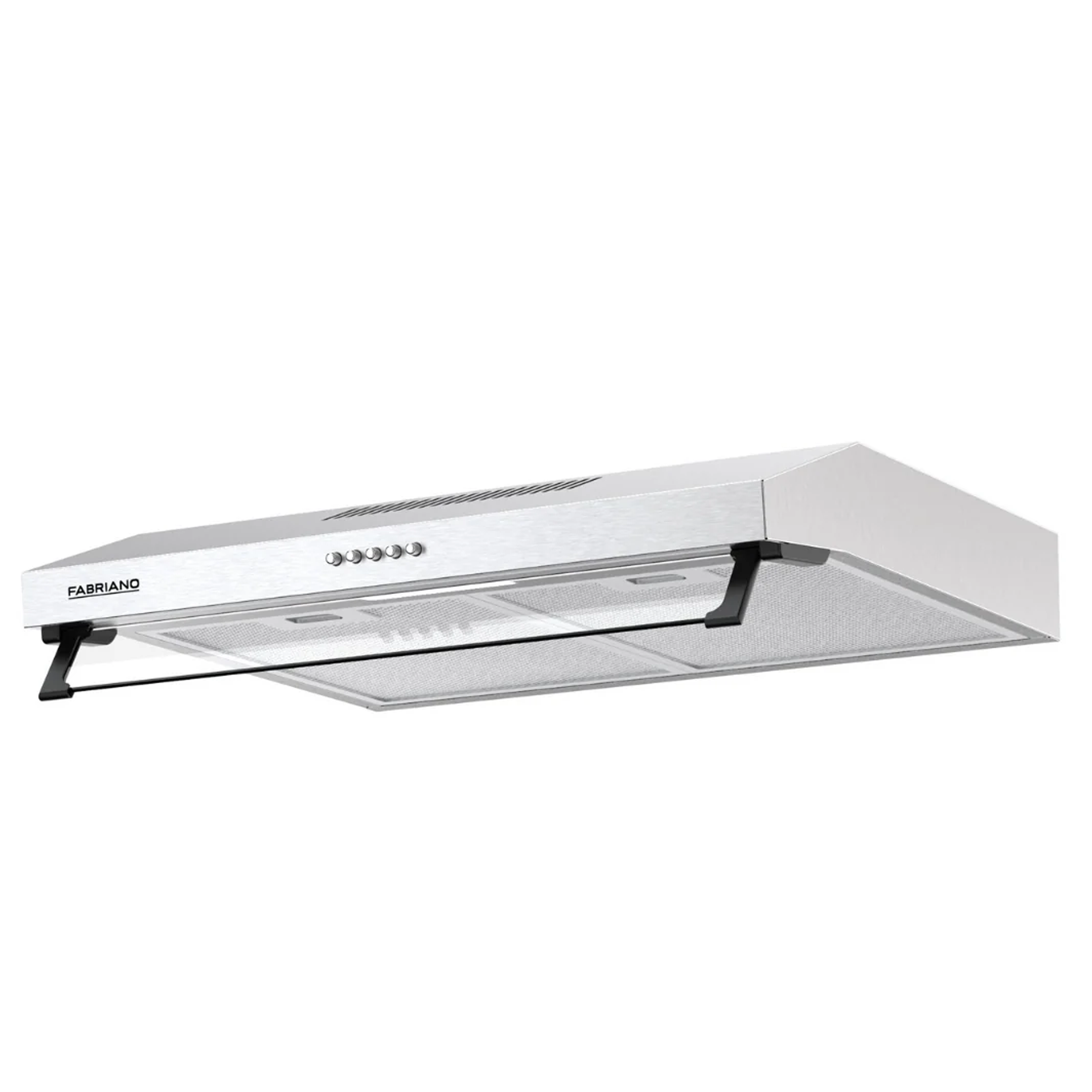 Design: Slim type design with a stainless steel finish. Installation: Designed for under-cabinet installation. Operation Modes: Can be configured for both recirculating and ducted exhaust systems. Controls: Operated via push buttons. Lighting: Equipped with one 2W LED lamp. Filtration: Features an aluminum filter. Speed Settings: Offers 3 fan speed settings. Visor: Includes a front glass visor.