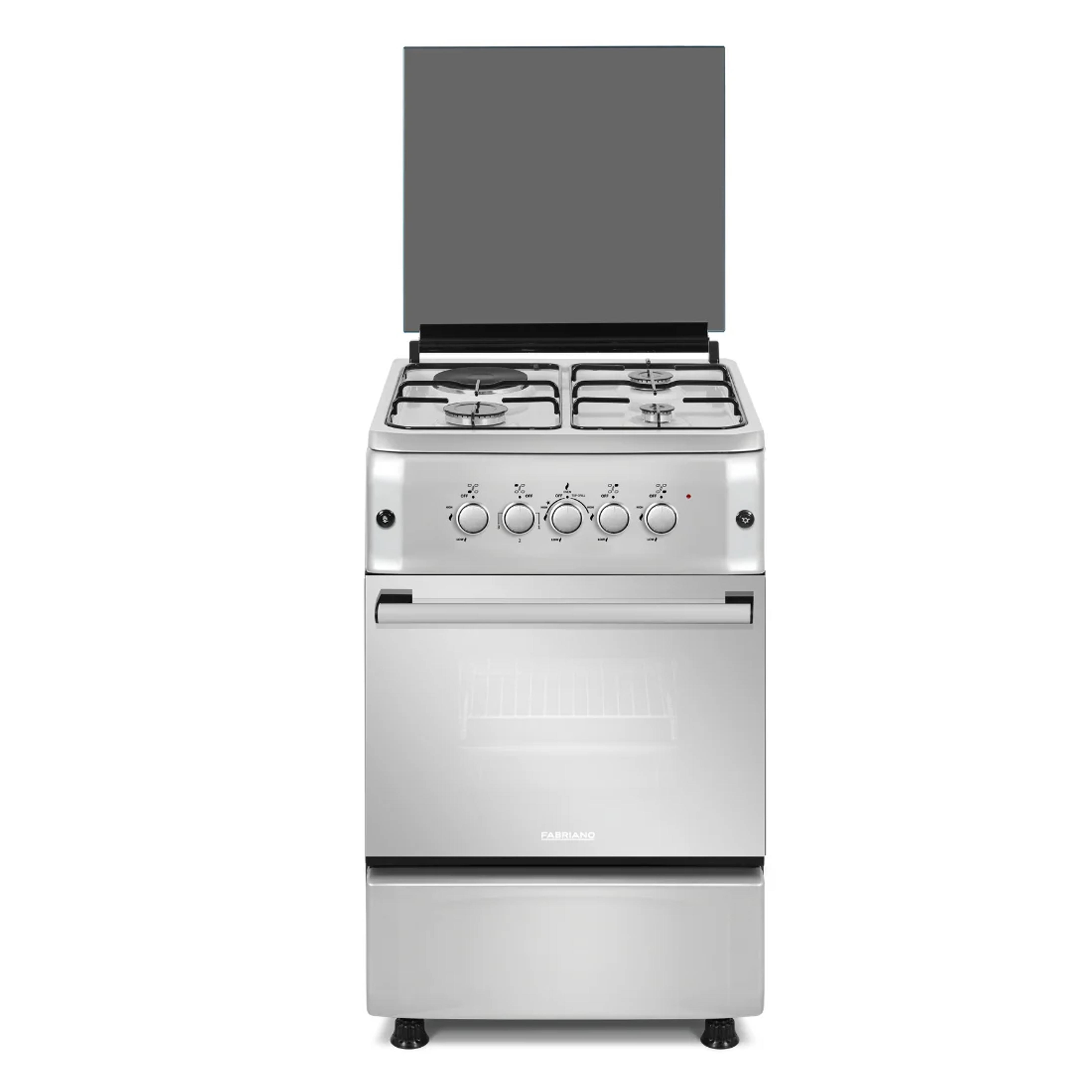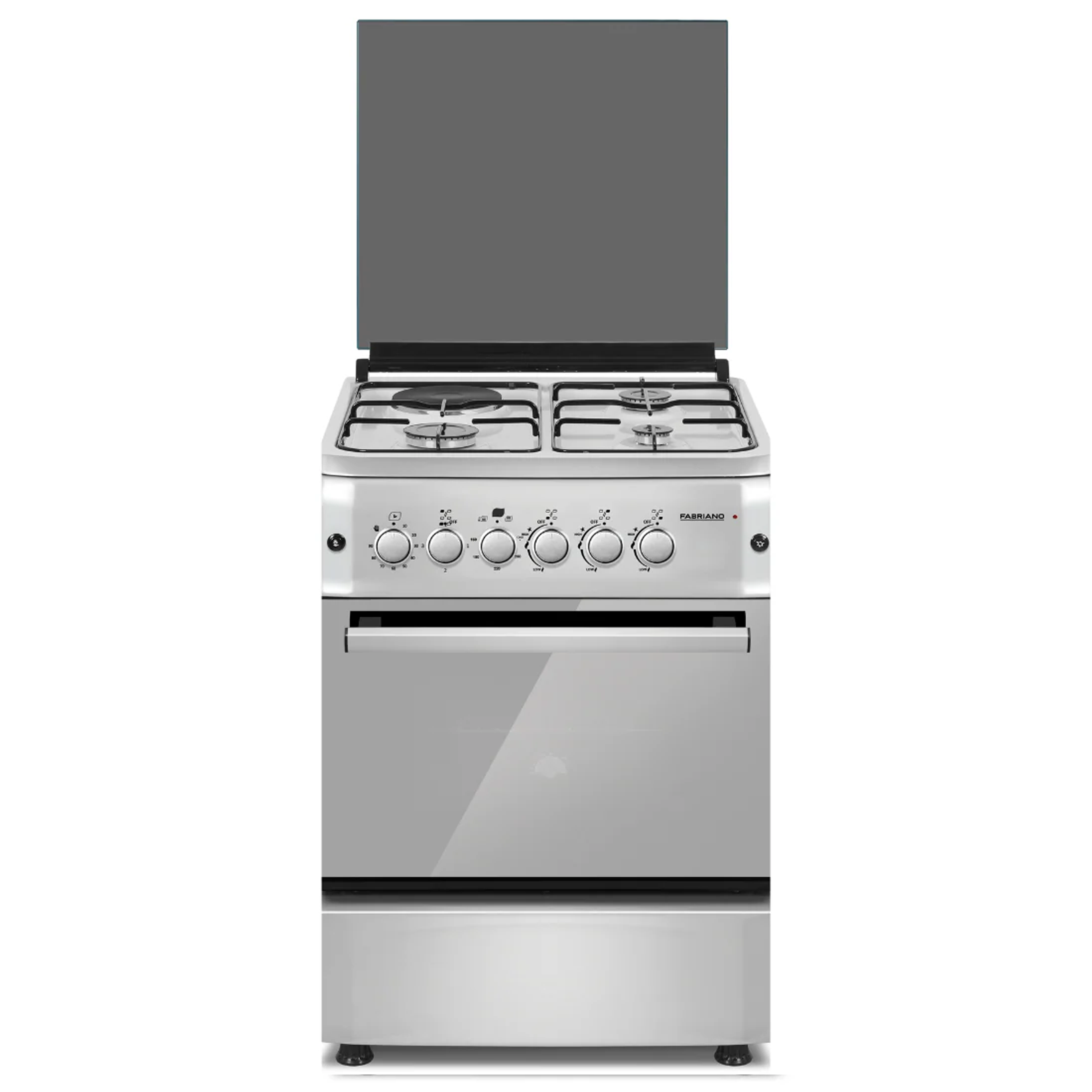 Top Burners: 3 Gas Burners + 1 Hotplate 1Kw Knob control ignition Sabaf Burners Flame Failure Safety Device Enamel Pan Support Adjustable legs Top Glass Cover Heat resistant control knobs Oven: 58L Volume capacity Flame Failure Safety Device for Oven Bottom Heating Oven w/ Thermostat Push Button Ignition Double Glass Insulation, Removable Gas Grill with Flame Failure Safety Device