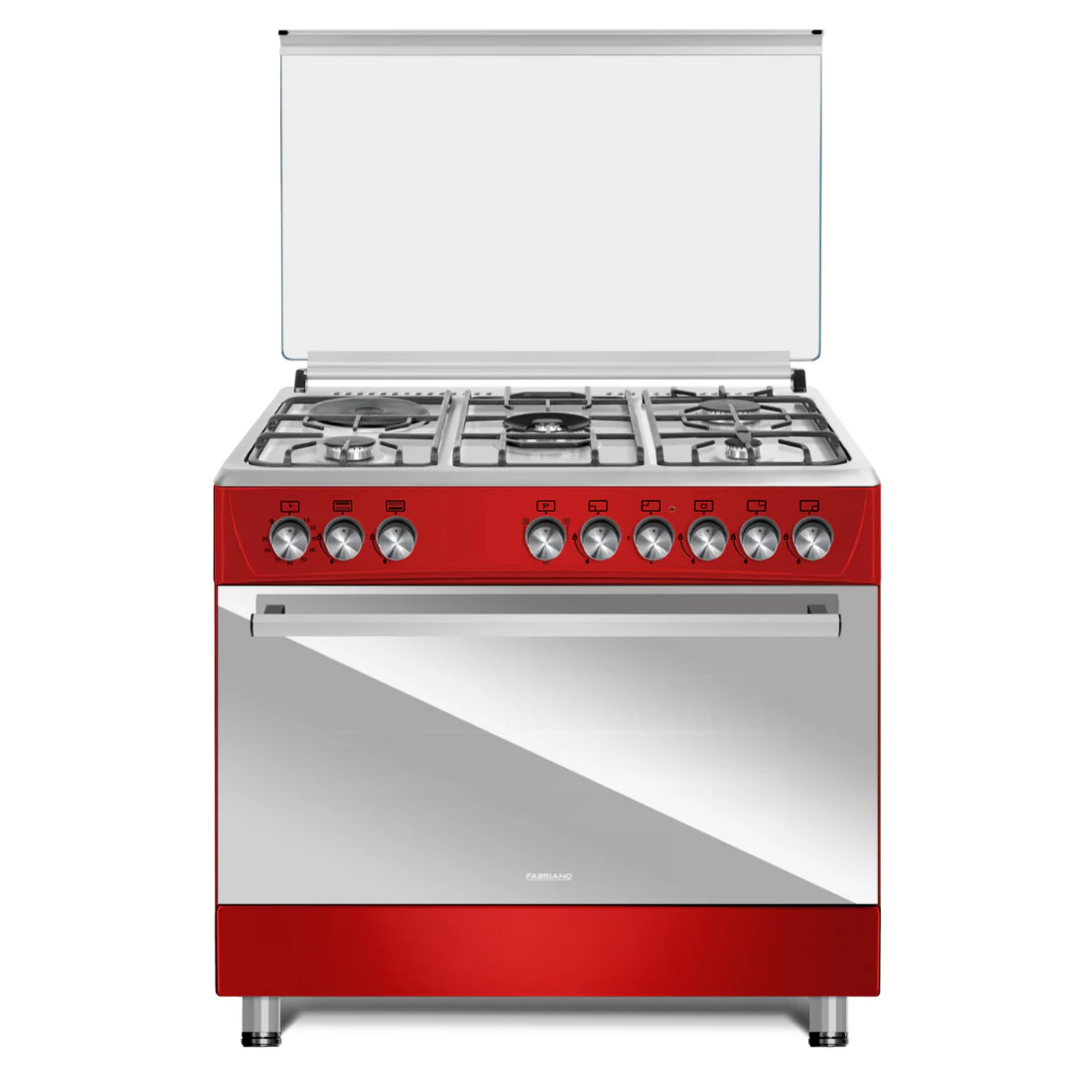 F9P41G2-RD is a 90 cm large freestanding gas range with a 4-burner gas hob + electric hot plate and a large gas oven with grill — blending powerful stovetop performance, flexible cooking options, and practical everyday functions.