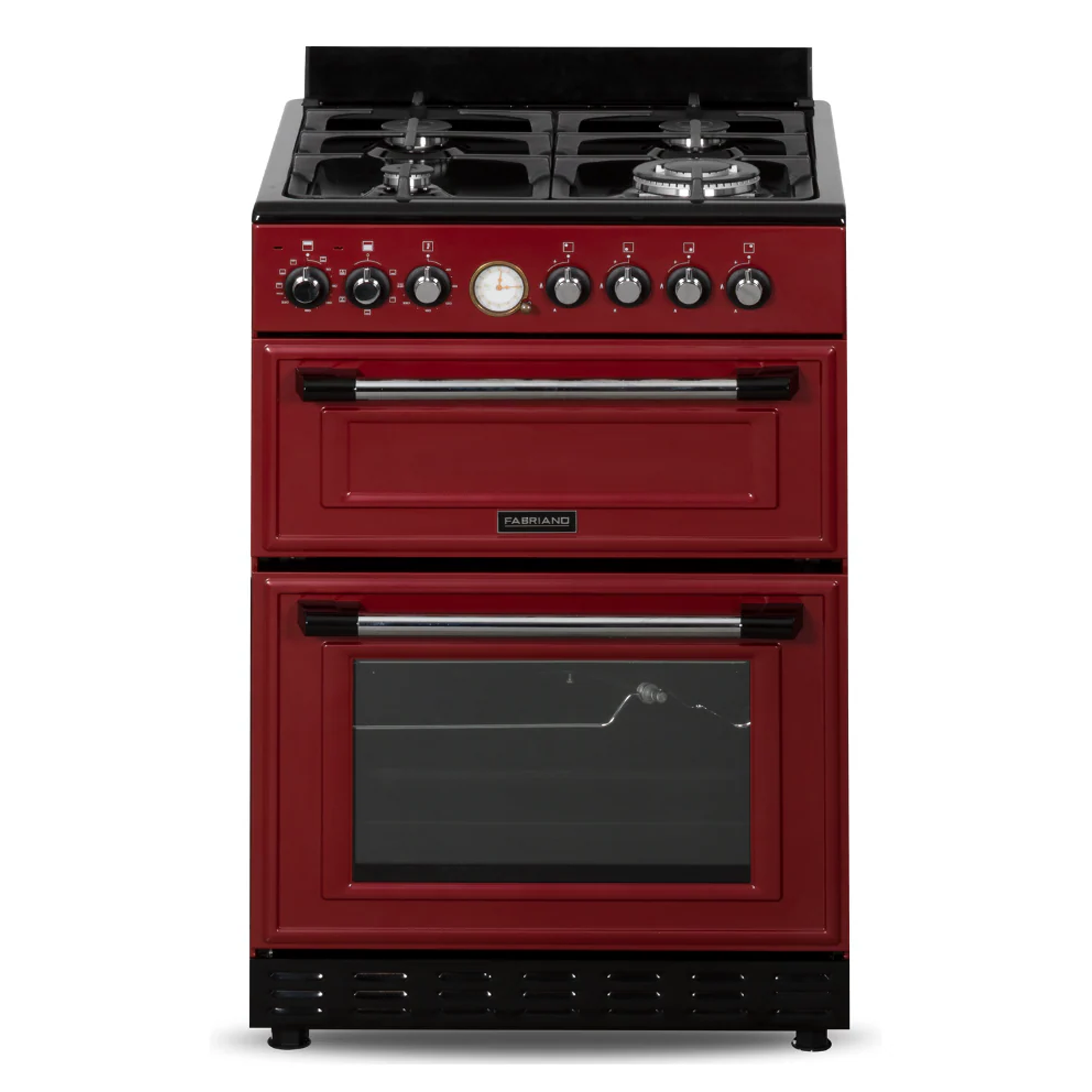 Free Standing Gas Cooker Bottom Burner + Gas Grill 4 Gas Pool Burners Full Ignition Matte Enamel Pan Support and Burner Caps Glass Lid Double Glass Oven Doors Mechanical Timer Oven Lamo 1 Oven Tray 1 Oven Grid Turnspit Safety Features for Oven Burners