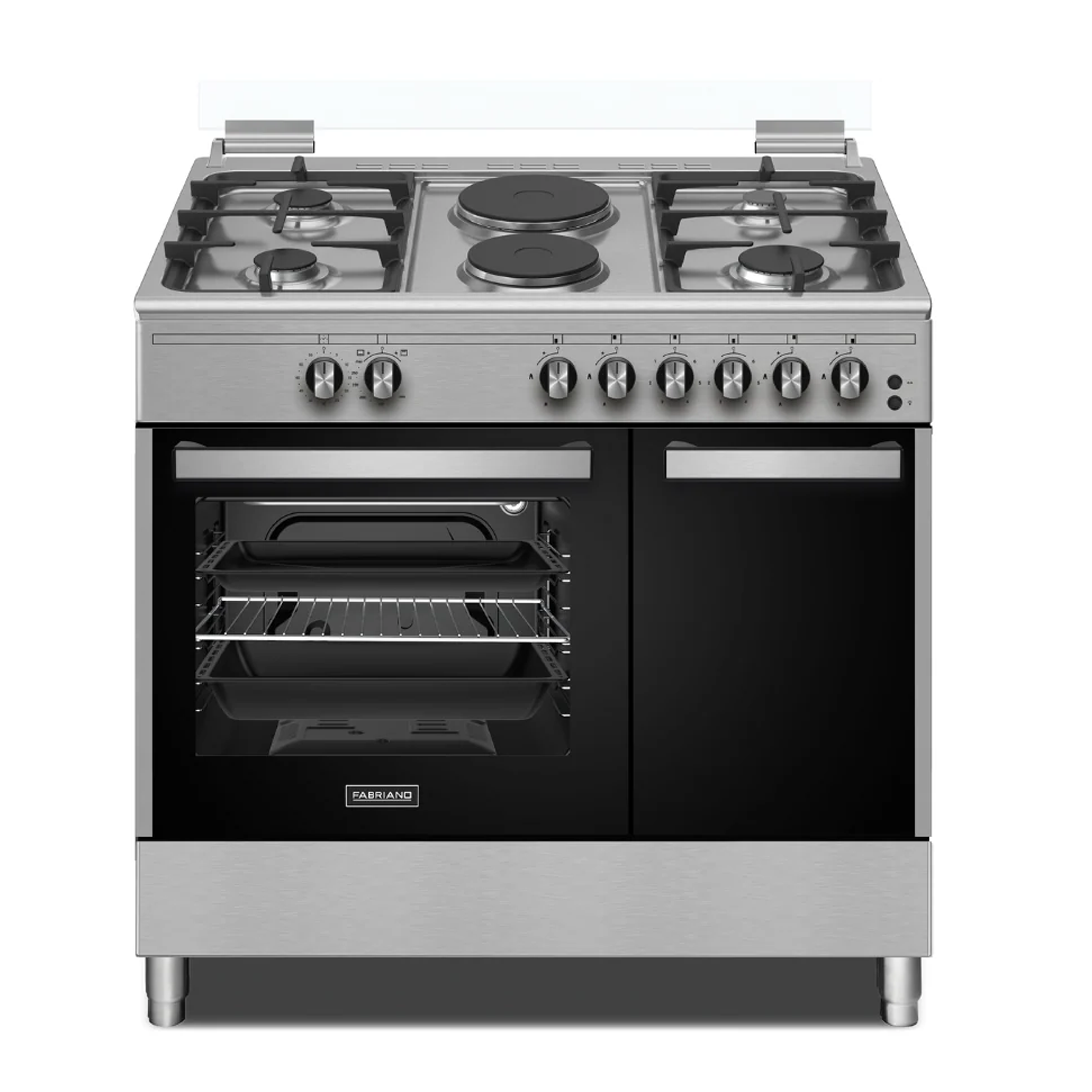 F9P41G2-SS is a 90 cm hybrid cooking range with 4 gas burners + 1 electric hot plate, a 98 L gas oven with grill, and practical features like safety devices, cast-iron pan supports, and a cooling fan — a solid choice for everyday family cooking and roasting needs