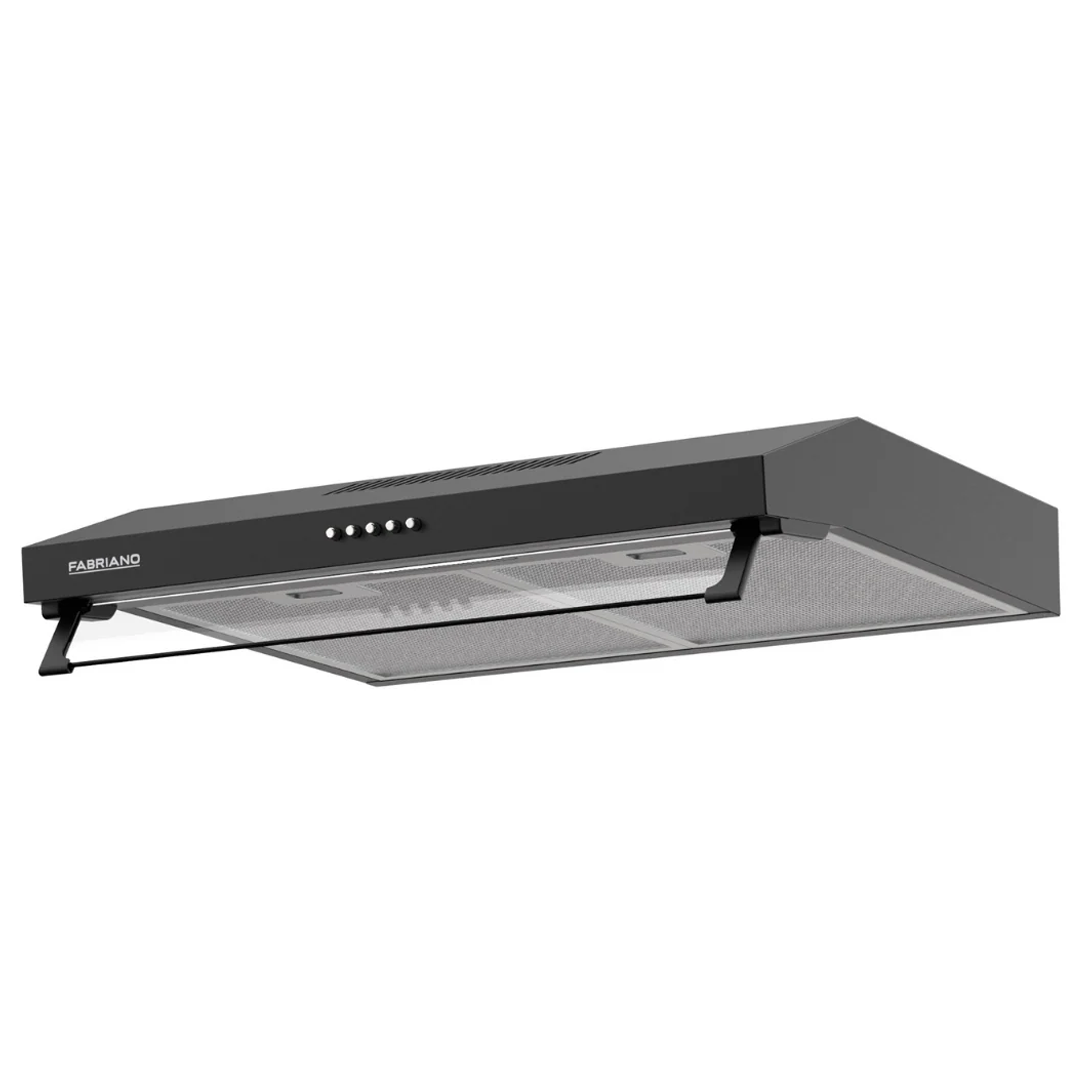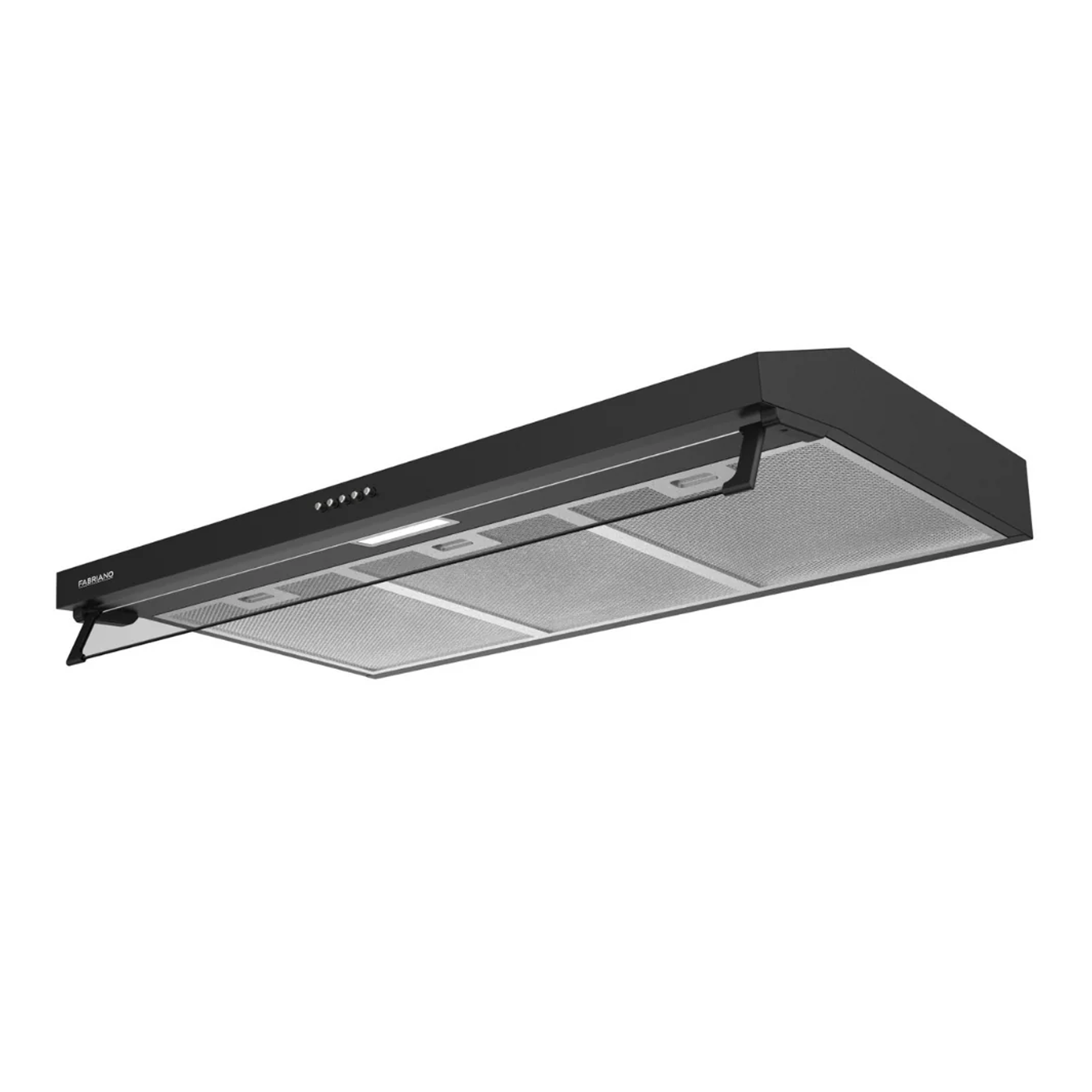 Design: Features a space-saving, slim design with a modern matte black finish and a front glass visor. Performance: Offers a suction capacity of 200 m³/h, suitable for effectively clearing smoke and odors in standard kitchen settings. Versatility: Supports both recirculating (using filters to clean the air and return it to the kitchen) and ducted installation options (venting the air outside). User Controls: Equipped with simple push-button controls to manage its 3 speed settings. Lighting: Includes one 2W LED lamp to illuminate your cooking area. Maintenance: Comes with a durable aluminum grease filter that is easy to remove and clean.