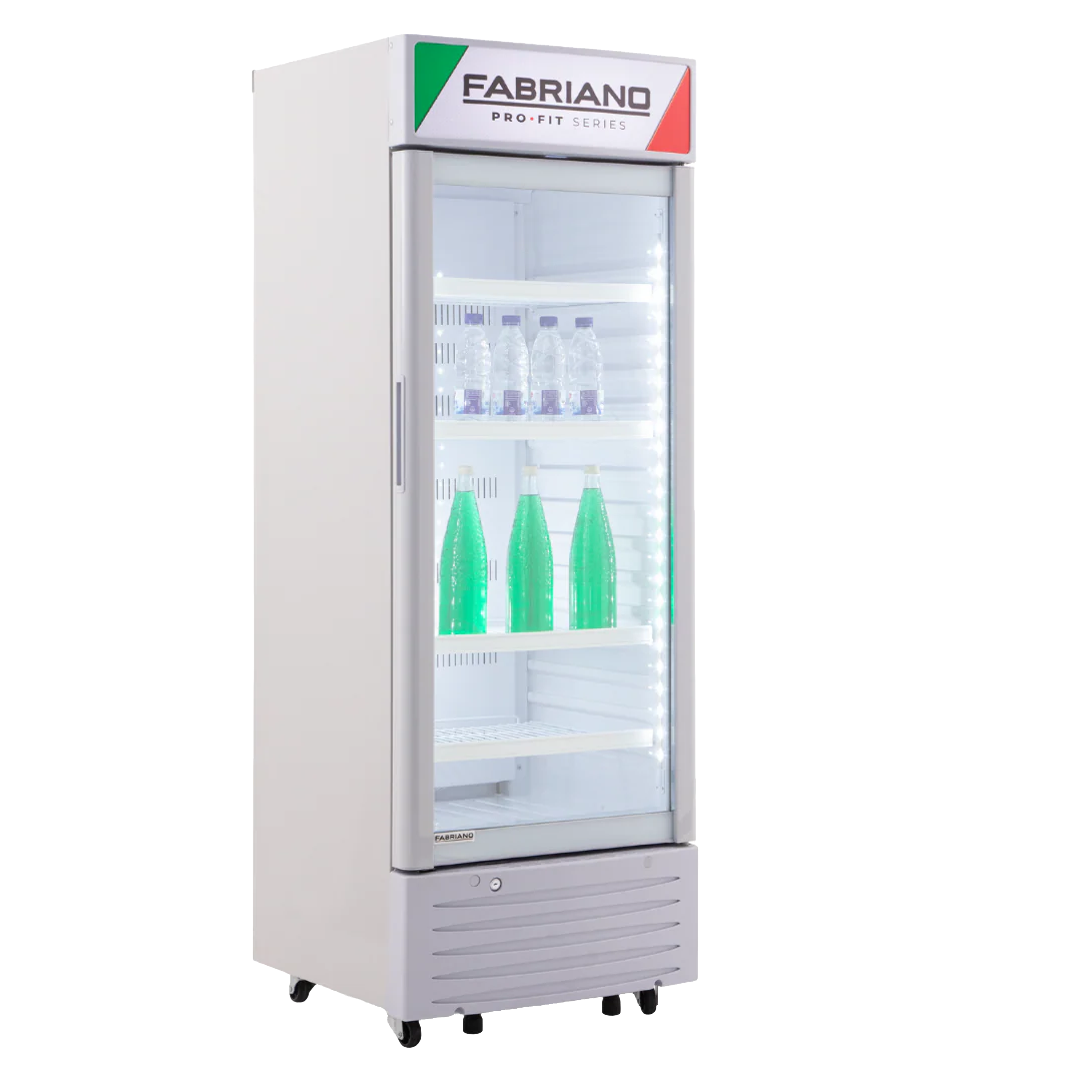 The Fabriano FSC11HSG is an 11 cubic foot, non-inverter, commercial showcase chiller (refrigerator) designed for merchandising drinks and other items. Key features include a self-closing glass door, "no frost" cooling system, and a lock and key mechanism