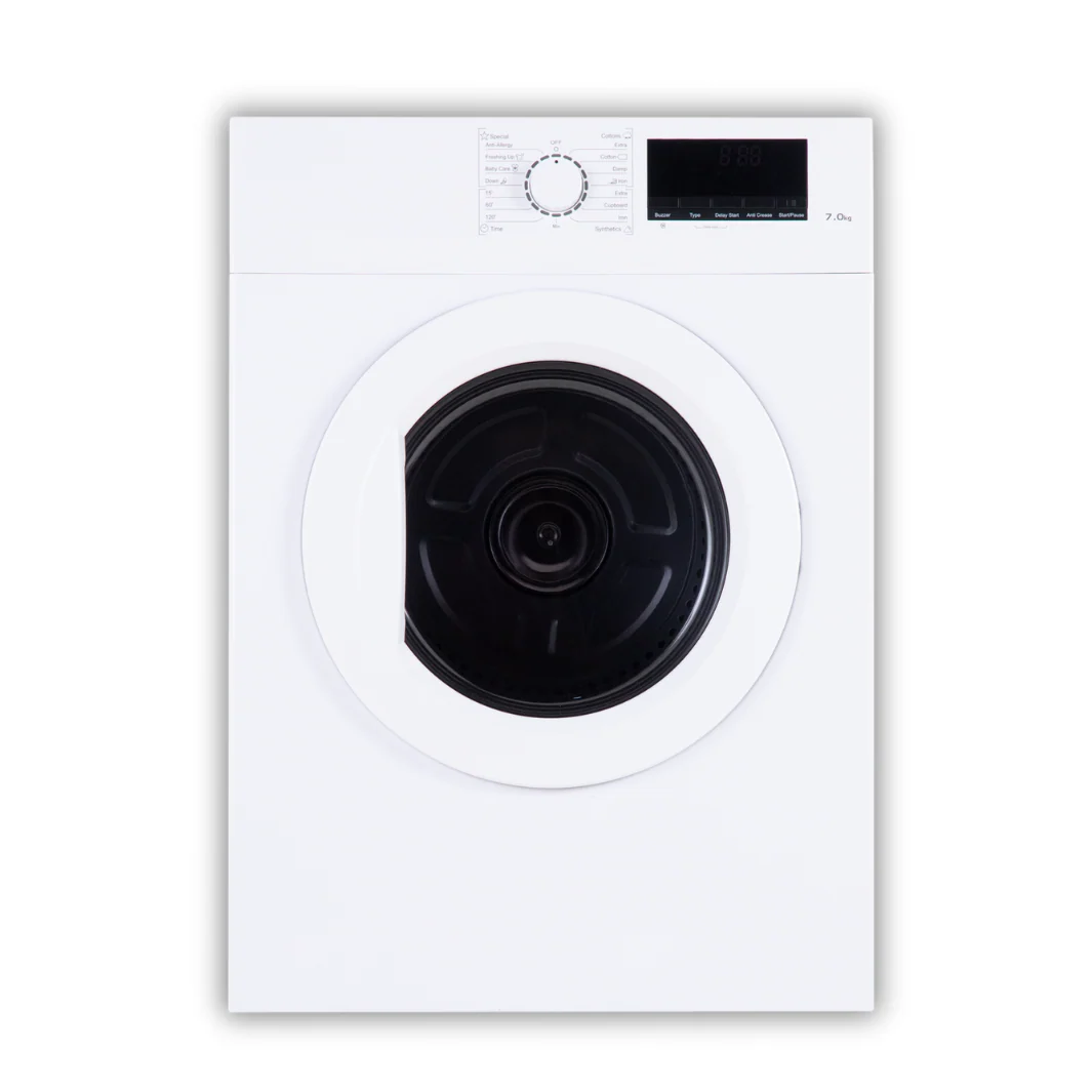 Dryer Type: Air Vented (requires external venting) Capacity: 7.0 kg Loading Type: Front Load Power Source: Electric (220-240V, 60Hz) Control Type: Electronical with an LED display Programs: 15 programs plus 5 additional buttons/functions (e.g., anti-crease function) Drum Material: Galvanized Special Features: Buzzer, drum light, and alternate rotation
