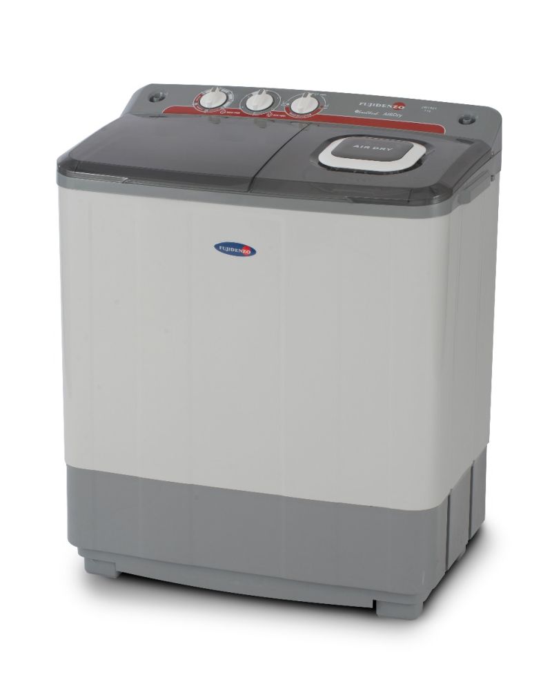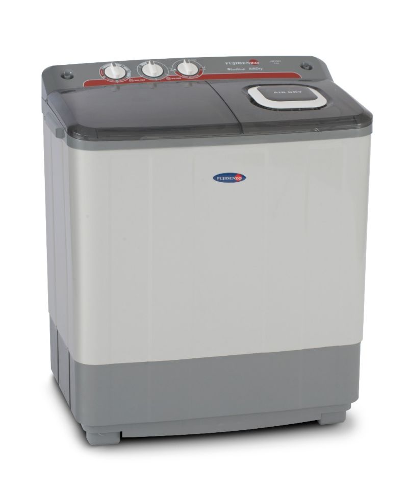 The Fujidenzo JWT-801 is an 8 kg twin tub washing machine, featuring an Eco-Soak function, Star-Fin pulsator with scrubbers for powerful cleaning, and an Air Dry spin cycle for near-air-dried results, all within a rust-proof, rat-proof plastic body with separate wash and spin tubs for simultaneous use, operating at 320 watts.