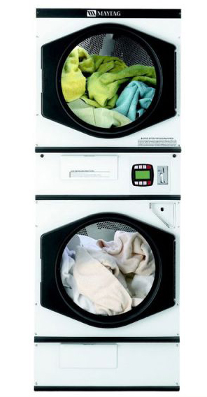 The Maytag MLG31PD is a heavy-duty, multi-load industrial stacked gas dryer, featuring two 13kg (28.6 lb) capacity pockets, fast axial airflow, ThermoGuard to prevent overheating, and a microprocessor control with an Accu Trac® Audit System for tracking, making it efficient for commercial laundromats, hotels, and other high-volume operations, boasting low BTU usage and improved insulation for energy savings.
