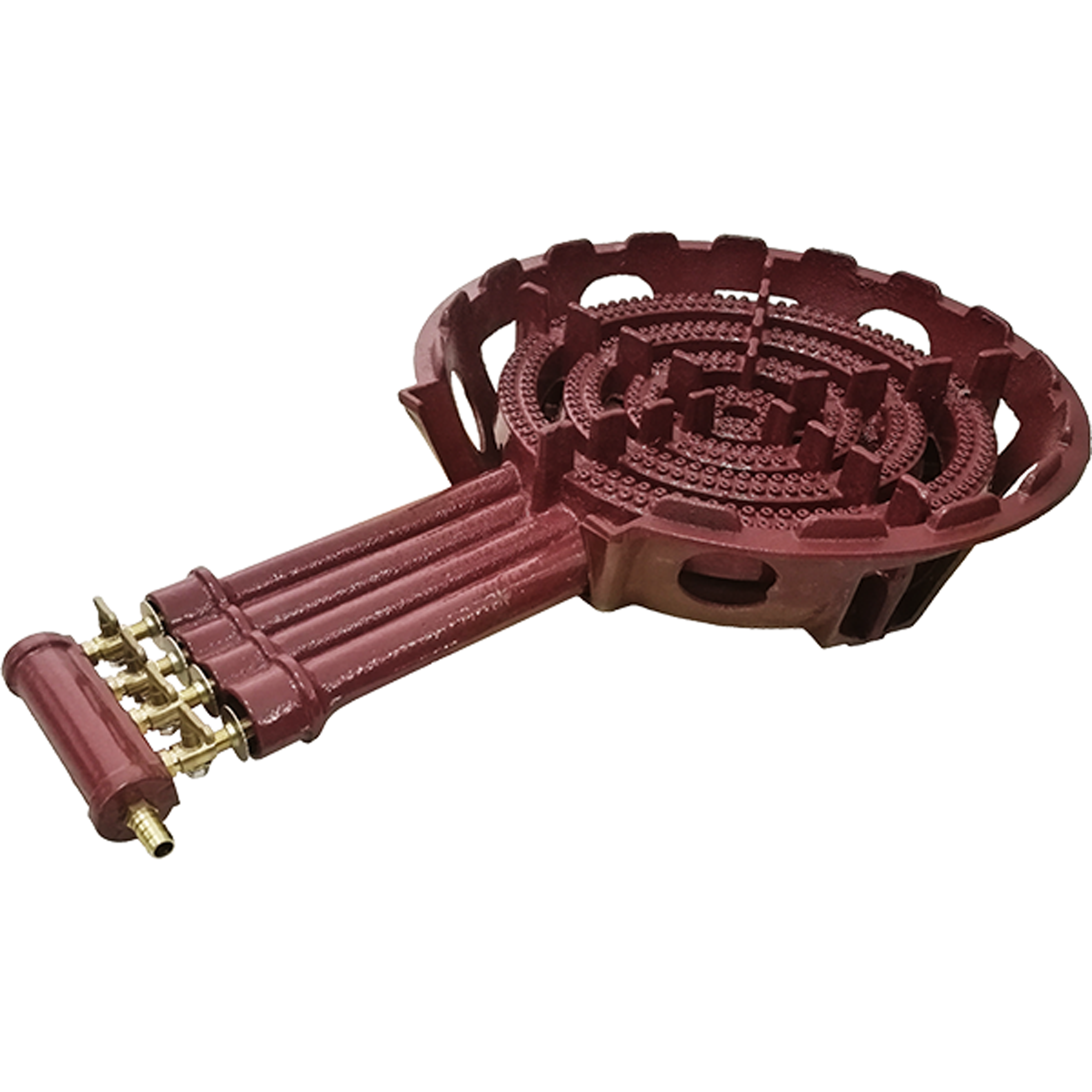 Four adjustable brass valves (control knobs/mechanisms for gas flow).