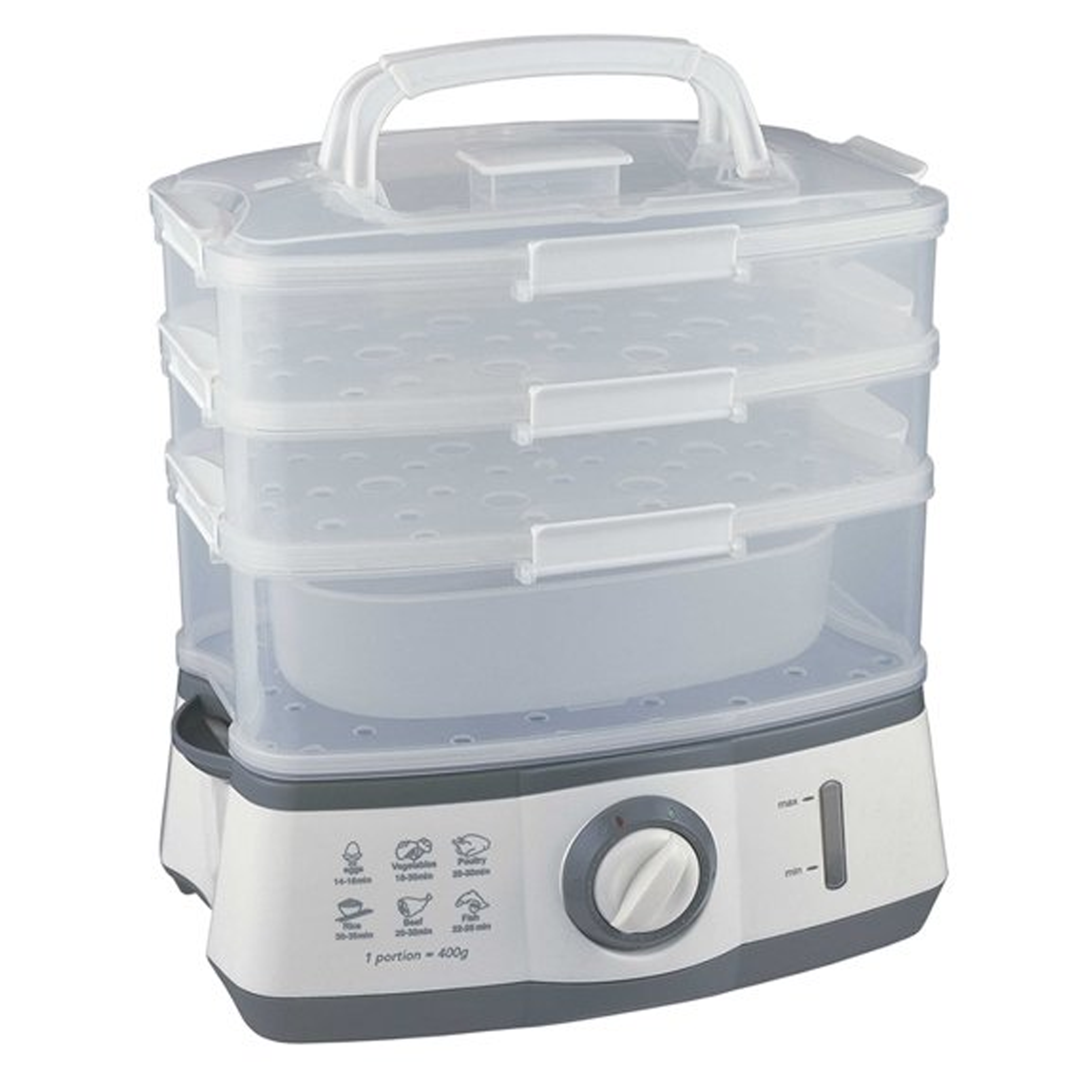 Food Steamer 9-Liter capacity 800W 60-minute timer Auto shut-off function On and Off light indicator Water level indicator Fast steam function With external water spout Bi-metallic thermostat control Durable high temperature steaming baskets Durable patented plastic lid grips Special lock system Submerged heater design for fast boiling Equipped with Thermal Cut-Off Fuse (TCO) Double insulated AC cord Accessories: Rice bowl, base tray