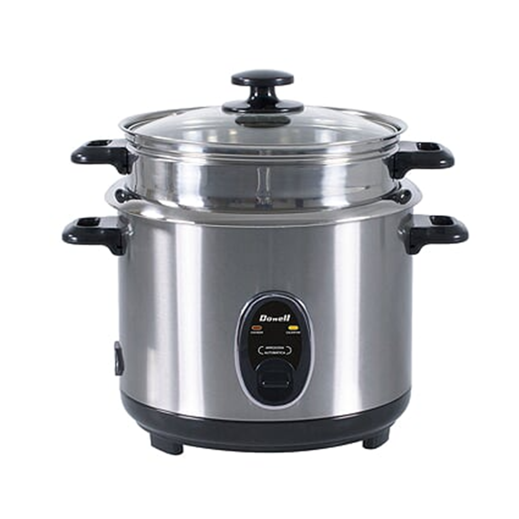 The Dowell RC-108SS is a 10-cup capacity, 700-watt stainless steel rice cooker featuring automatic cook/warm functions, a tempered glass lid, and a steamer, ideal for everyday rice cooking with basic controls and accessories like a measuring cup and serving spoon. It offers durable stainless steel construction for both the body and inner pot, though the inner pot may require soaking after use as rice can stick.