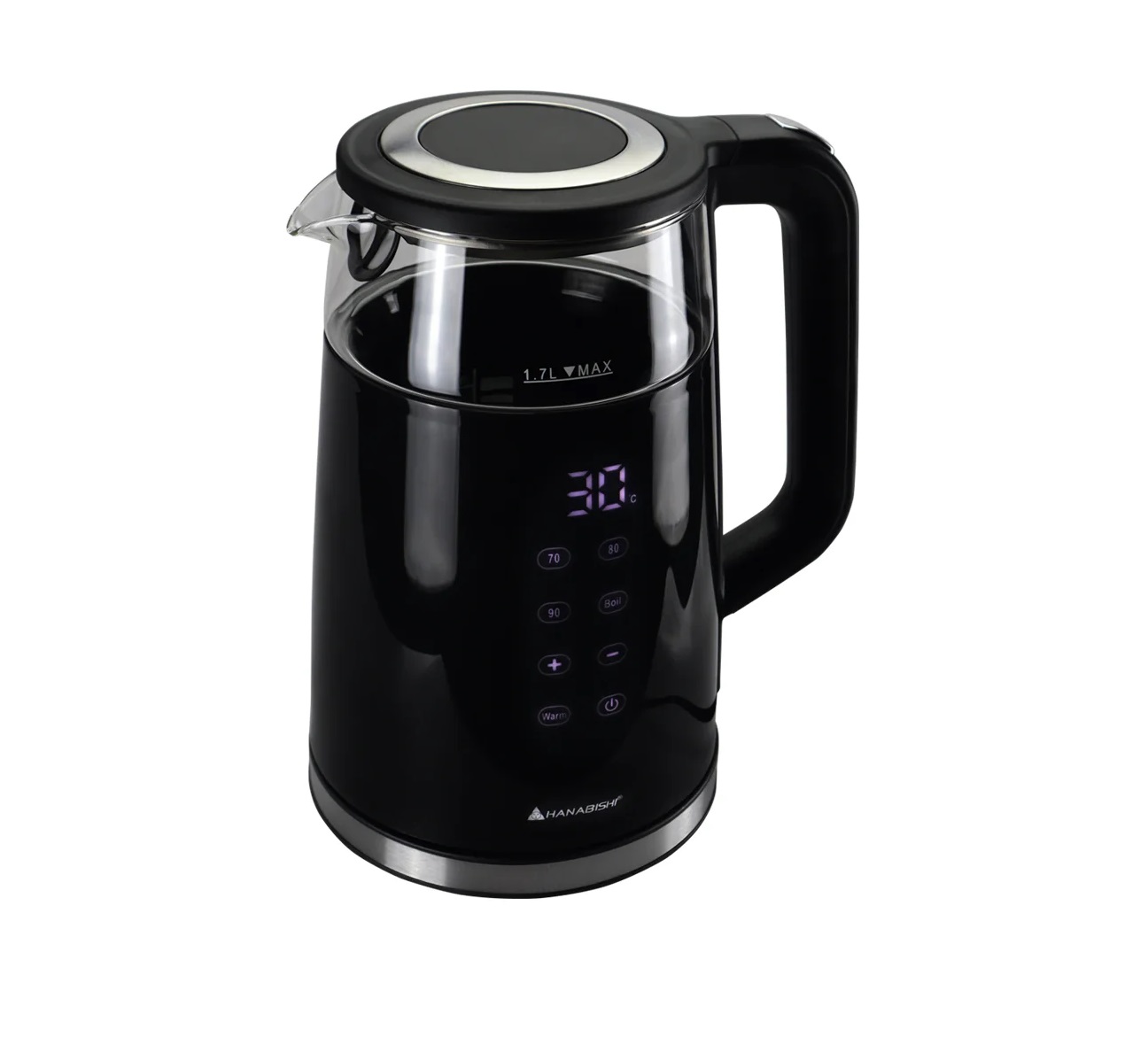 Capacity: 1.7 Liters Material: High borosilicate glass body, PP (Polypropylene) exterior, stainless steel interior & heating element Temperature Control: Digital display, Electronic touch panel, 4 preset temperatures (70°C, 80°C, 90°C, 100°C) Functions: Boil, 2-Hour Keep Warm, 10x Memory Function (13 levels) Design: 360° rotary base, Cool-touch exterior, Large opening for easy fill/clean, Concealed heating element Safety: Auto shut-off, boil-dry protection (implied by auto shut-off)