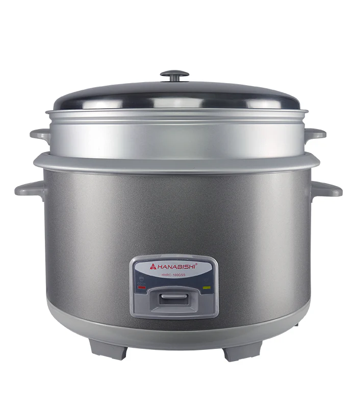 The main Hanabishi HHRC-100GSS rice cooker unit An aluminum inner pot (the cooking pot) A stainless steel cover (lid) A steamer accessory A measuring cup A spatula A detachable power cord A manual or instruction booklet (implied)