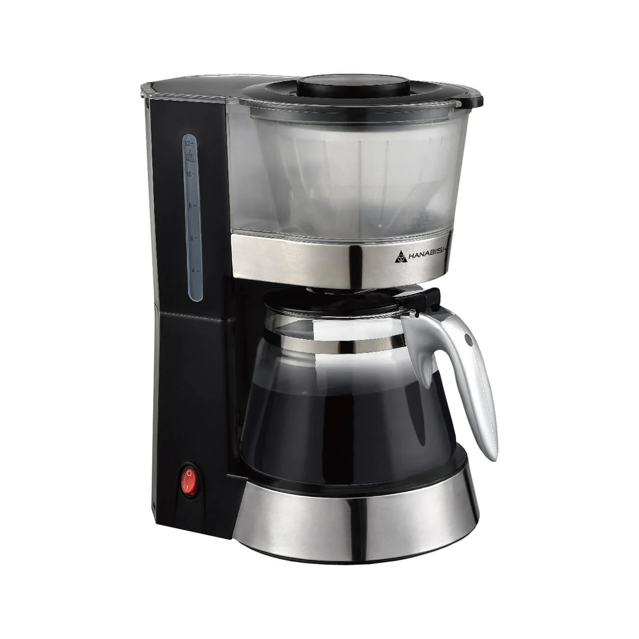 Main Coffee Maker Unit: The primary appliance with a non-stick heating plate, a hinged tank lid, and a water level indicator on the tank. Glass Carafe: A heat-resistant glass pitcher designed to hold the brewed coffee. Permanent Filter: User Manual/Instruction Booklet