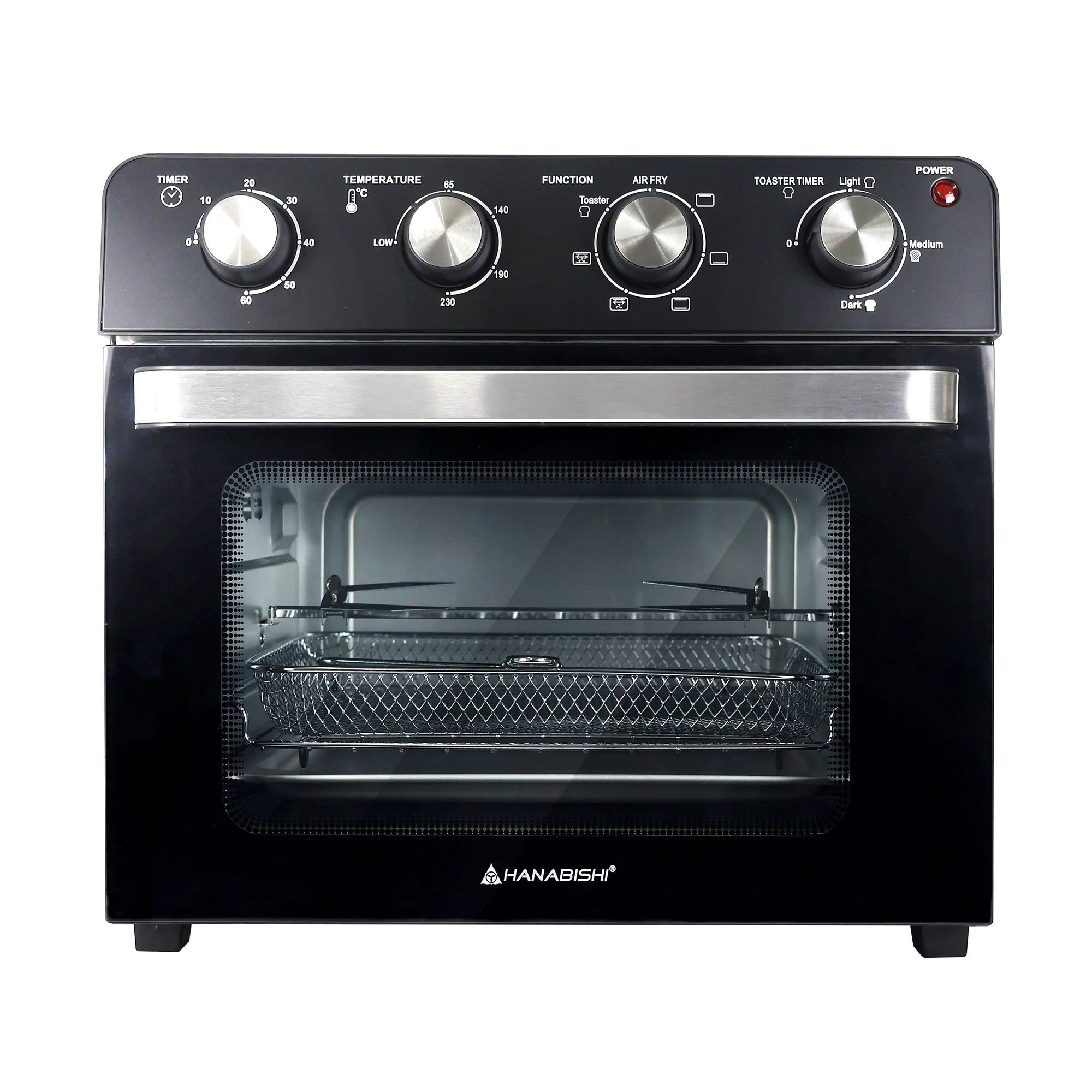 Capacity: 30 liters 65-230°C adjustable thermostat With rotisserie function With convection function Inner lamp Knob selector for heating and functions 60-minute timer with bell ring/auto shutoff Can air fry up to 3 lbs, toast 6 slices of bread, bake 4lbs of chicken or 12" pizza Quiet operation Stainless steel heating elements Accessories: 1 pc air fryer basket, 1 pc baking pan, 1 pc oven rack, 1 pc rotisserie set 230V 1600W Unit size: 435 x 400 x 390mm Box size: 465 x 445 x 425mm
