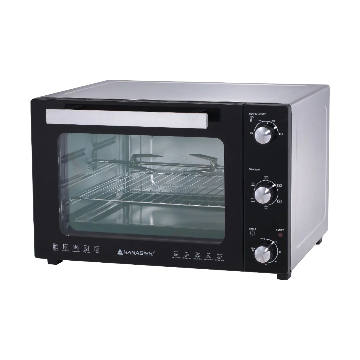 55-liter capacity 60 min. timer with bell ring Thermostat control 100 to 250°C Stainless steel heating elements Stainless steel housing Convection function Rotisserie function Inner light Indicator lamp 5 Stages of heating & function selector Heating selector switch Tempered glass door Accessories: bake tray, baking rack, tray/rack handle, rotisserie stick, and rotisserie fork Inner dimension 420x340x290mm 575x440x372mm