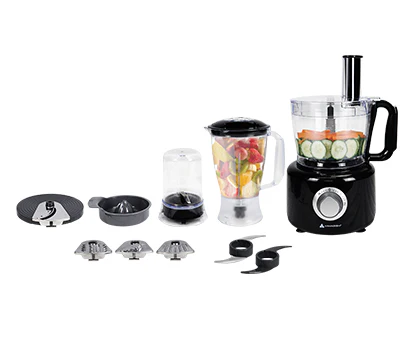 Main unit/motor base 1500 ml blender jar Chopper bowl Stainless steel blades for chopping, shredding, slicing, granulating, and french fries Powerful citrus juicer attachment/kit Grinder attachment/jar Dough mixer/kneader plastic blade Egg beater Pusher Manual/instruction booklet