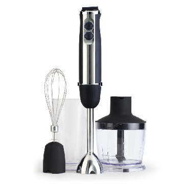 Powerful Motor: Features an 850-watt motor with "Complete Turbo Strength" for high-efficiency blending. Advanced Blade: Equipped with a rust-free, 6-fold gold titanium blade. Customizable Speed: Includes a 2-speed soft-touch switch and a variable speed controller. Durable Build: Designed with a stainless steel housing and a black rubber finish for a strong, comfortable grip. Versatile Use: Suitable for making tomato sauce, smoothies, whipped cream, pesto, and soup.