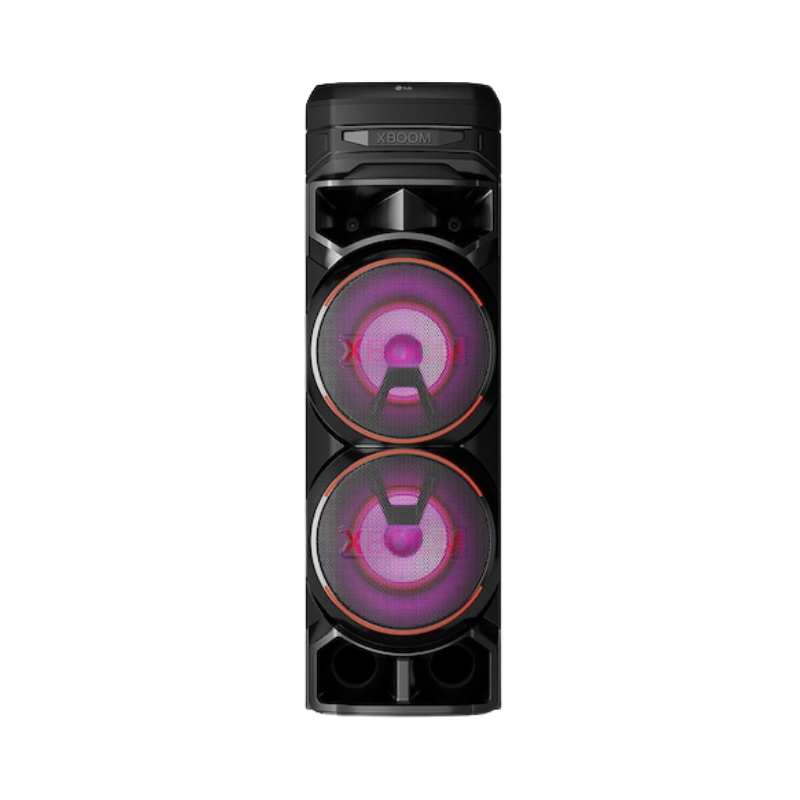 Sound: The speaker system includes dual 8-inch woofers and dual 1-inch tweeters, featuring Super Bass Boost technology to generate deep, thumping bass. Lighting: It has multi-color (RGB) LED lights that change and pulse with the rhythm of the music to create a party atmosphere. DJ and Karaoke Functions: Users can apply sound effects directly from the DJ App (on Android or iOS devices) or use the DJ Pad on the speaker itself. It also features a Karaoke Creator, which includes vocal effects, a voice canceller, and key changer. Connectivity: It offers multiple connection options including Bluetooth, two USB inputs, an optical input, and inputs for both a microphone and a guitar. Wireless Party Link: You can wirelessly link two LG XBOOM RNC9 units to double the sound output for a bigger party experience. TV Sound Sync: The speaker can be connected to a compatible LG TV via Bluetooth for a more immersive audio experience.